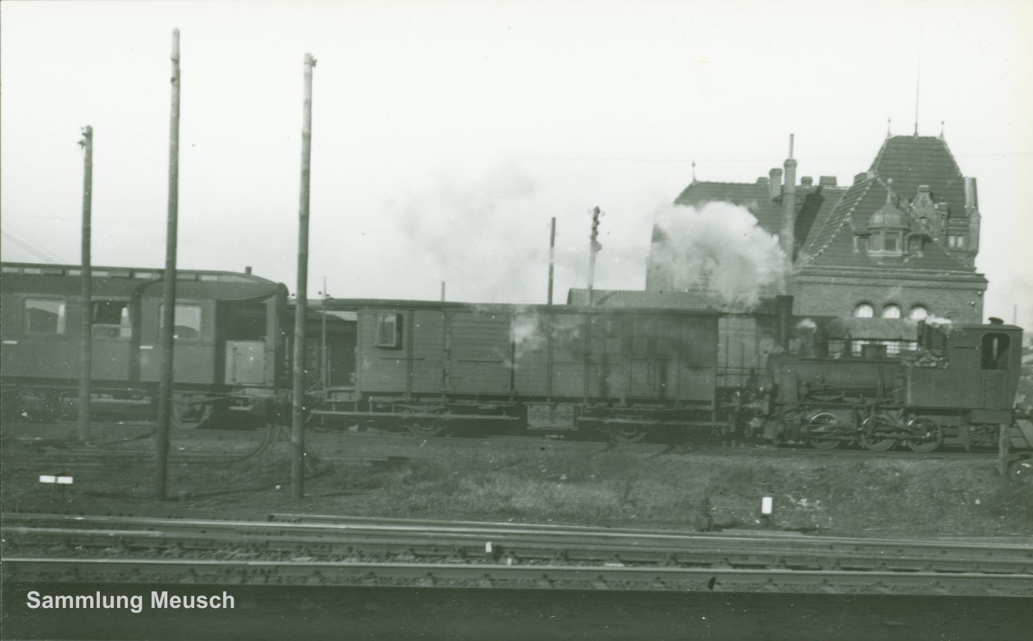 Aus dem Jahre 1935 stammt diese Aufnahme. Leider lassen sich keine Anschriften der Fahrzeuge ablesen. Bei der Lokomotive muss es sich um eine der ersten 4 angeschafften Loks handeln. Bei dem PPost kämen die Wagen 51, 52 oder 54 in Frage und der Personen-wagen könnte einer der beiden bei Falkenried gebauten Nr. 14 oder Nr. 15 sein. Ein sehr ähnliches Modell wurde 1913 aus Görlitz mit der Nummer 20 angeschafft, der ab 1914 die Nummer 16 bekam.