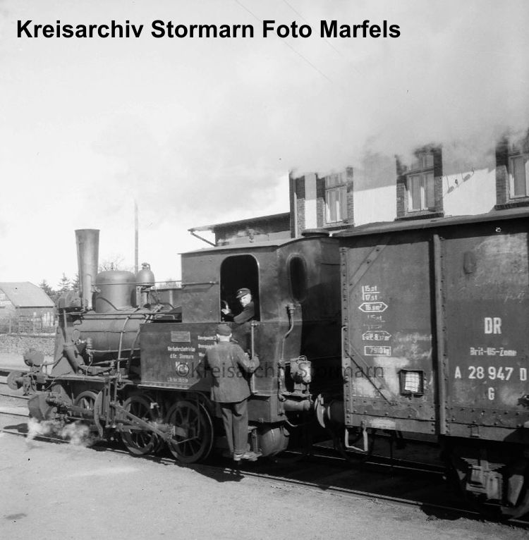Neben den neuen Triebwagen dominierten natürlich die Dampf-lokomotiven in Trittau. Bis zum Bau der Lokwerkstatt in Willinghusen - Stemwarde wurden hier im Lokschuppen kleine Reparaturen durchgeführt. Links und oben sind Güterzüge auf Gleis 1 zu sehen. Leider wurden solche Szenen viel zu selten fotografisch festgehalten. Auf dem Foto unten sind W. Schomann und W. Studt auf der Lok Nr. 4 mit dem Namen 'Schwan' zu erkennen. Auf der unteren linken Aufnahme ist die Lok Nr. 5 mit dem Namen 'v. Bonin' vom Lokschuppen aus zu erkennen, dahinter der mit den Triebwagen neu beschaffte Beiwagen VB20 und dahinter das Empfangsgebäude.